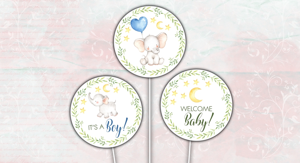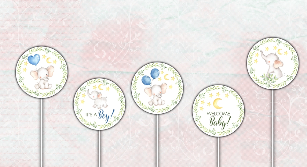 Elephant Baby Shower for Boy Cupcake Toppers, printable, PDF. file with high 300dpi resolution.