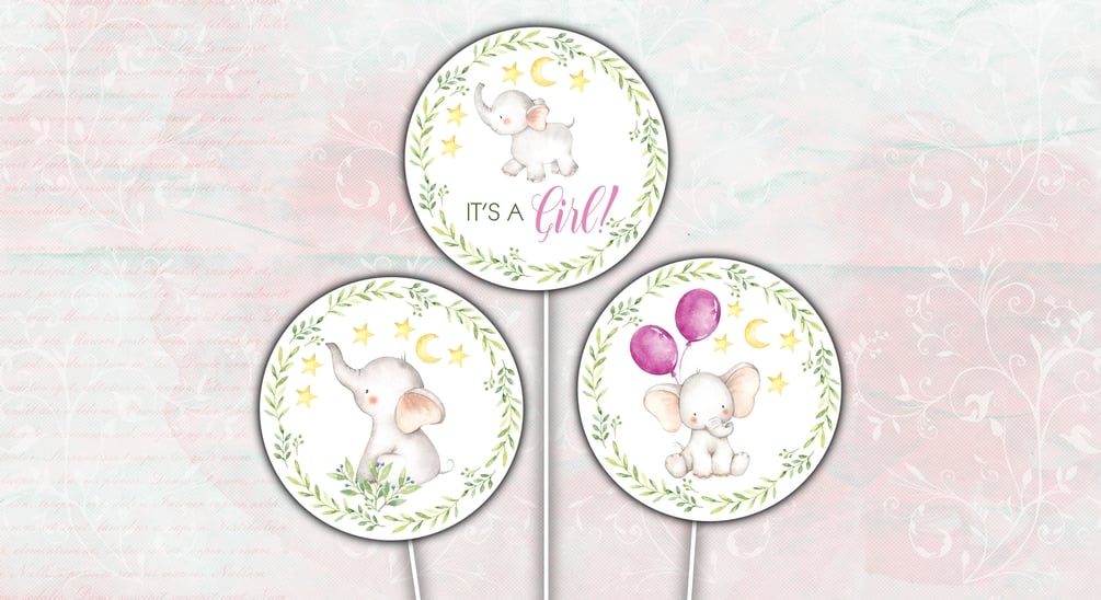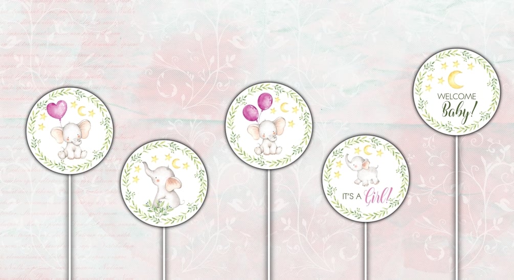 Elephant Baby Shower for Girl Cupcake Toppers, printable, PDF. file with high 300dpi resolution.